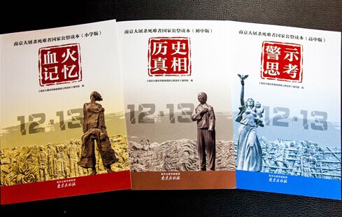 《南京大屠殺死難者國家公祭讀本》小學版《血火記憶》、初中版《歷史真相》、高中版《警示思考》。 沈瑩 攝