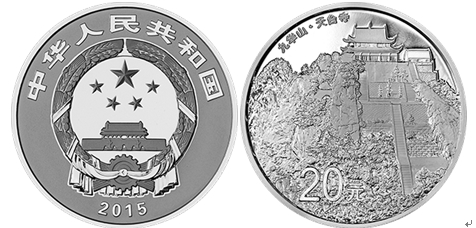 中國人民銀行定于2015年4月28日發(fā)行中國佛教圣地(九華山)金銀紀(jì)念幣一套。該套紀(jì)念幣共5枚,其中金幣3枚,銀幣2枚,均為中華人民共和國法定貨幣。該套金銀紀(jì)念幣正面圖案均為中華人民共和國國徽,并刊國名、年號。62.208克(2盎司)圓形銀質(zhì)紀(jì)念幣背面圖案為“天臺寺”景觀造型,并刊“九華山•天臺寺”字樣及面額。該圓形銀質(zhì)紀(jì)念幣為精制幣,含純銀2盎司,直徑40毫米,面額20元,成色99.9%,最大發(fā)行量60000枚。該套金銀紀(jì)念幣由深圳國寶造幣有限公司鑄造,中國金幣總公司總經(jīng)銷。