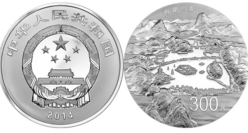 1公斤銀幣為精制幣,正面圖案為中華人民共和國國徽,并刊國名、年號。背面圖案為“西湖全景”景觀造型,并刊“西湖全景字樣及面額。含純銀1公斤,直徑100毫米,面額300元,成色99.9%,最大發行量300枚。