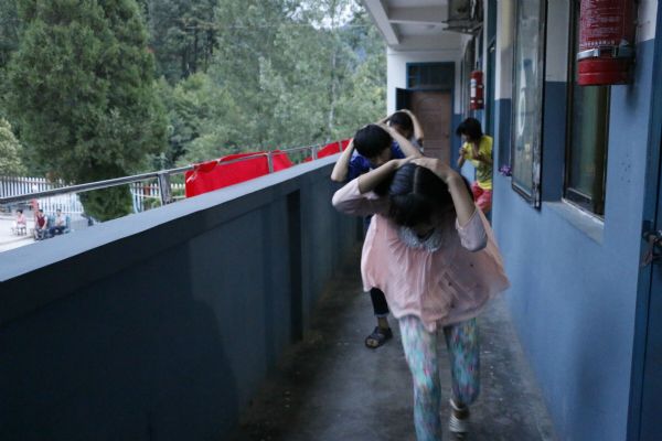 “趕緊抱頭、鉆到桌子下面去”這是洛陽師范學院三下鄉實踐隊為山區孩子舉行地震安全演練的場景。今年南方北方大部分地區遭遇洪澇災害,沿海地區遭遇臺風,自然災害頻繁發生,為提高山區兒童的安全意識,增強孩們的逃生能力,三下鄉實踐隊開展了此次安全演練活動。