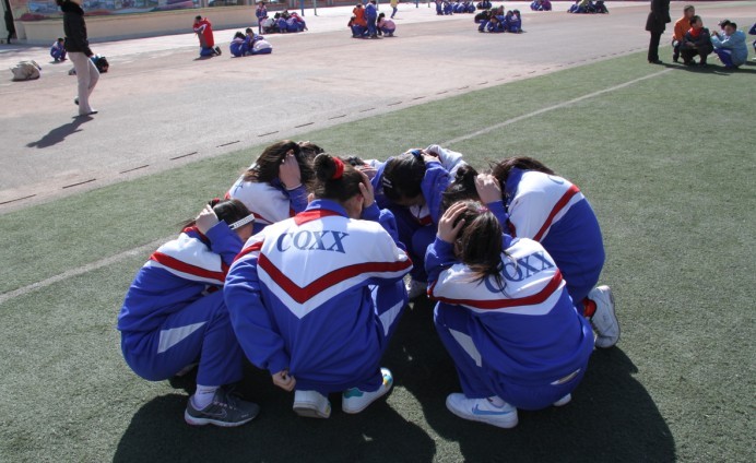 演習當天,在副總指揮發出“地震來臨,請大家快速躲避”的信號后,老師們立即停止上課,并指揮學生迅速抱頭、閉眼、躲到各自的課桌旁或課桌下,并要就近尋找軟物保護頭部。大約過了一分鐘左右,副總指揮宣布“強震已過,快速撤離”的口令,師生們按照預定的疏散路線,快速地撤離到了操場的中心地帶,繼續抱頭、蹲下。