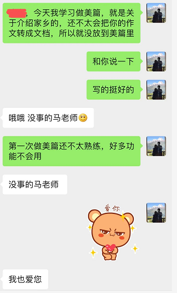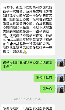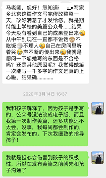 正美呢,就收到了檬檬媽的私信:“馬老師,您好!檬檬這篇作文認真撰寫修改了一天,滿意了才發給您,就是期待能得到您的肯定……今天卻聽著哭聲不斷的傳出來,想問一下您,她寫的作文是不合格嗎?還是有其他原因?”