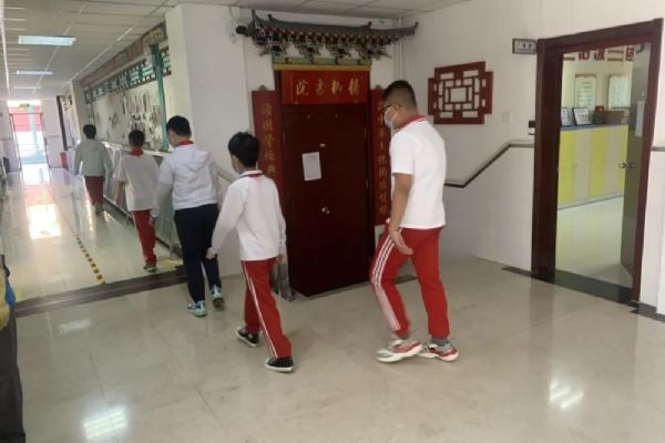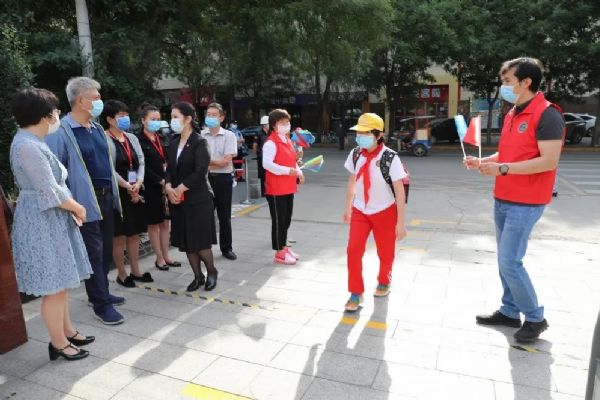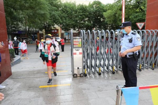 早晨7:00,身著紅馬甲、手持小彩旗的志愿者老師們,站在各自的點位上,微笑著指引學生分流有序入校進班,沉寂了數個月的校園重獲生機。