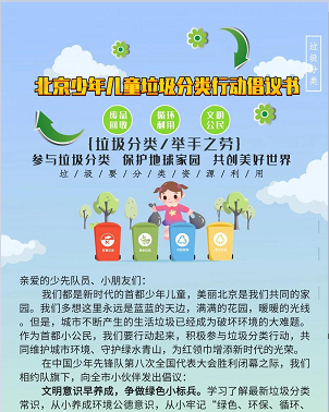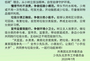 親愛的同學們,作為首都小公民我們要積極貫徹落實《北京市生活垃圾管理條例》,按照市委市政府、區委區政府有關生活垃圾分類工作部署,持續鞏固“小手拉大手,垃圾分類一起走”活動成果,從小接受環保教育,學習垃圾分類知識,培養愛護環境、珍惜資源的意識,同時參與垃圾分類實踐,實現“教育一個孩子、帶動一個家庭、影響一個社區”的目的。垂楊柳中心小學特在暑假期間開展“爭做垃圾分類小能手 引領朝陽環保新時尚”暑期系列實踐活動。