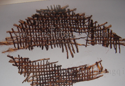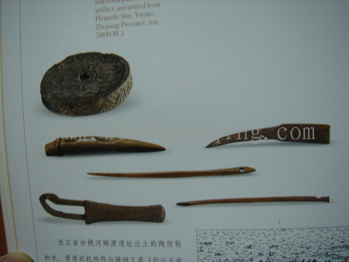經考古浙江余姚河姆渡遺址(距今約7000年)發現有麻的雙股線,在出土的牙雕盅上刻劃著4條蠶的圖紋,同時出土了紡車和紡機零件,已應用經緯線工藝技術。江蘇吳縣草鞋山遺址(距今約6000年)出土了編織的雙股經線的羅(兩經絞﹑圈繞起菱紋)地葛布,經線密度為10根/厘米,緯線密度地部為13~14根/厘米,紋部為26~28根/厘米,是最早的葛纖維紡織品,。浙江吳興錢山漾遺址(距今5000年左右)出土了精制的絲織品殘片﹐絲帛的經緯密度各為48根/厘米,絲的拈向為Z拈;絲帶寬5毫米,用16根粗細絲線交編而成;絲繩的投影寬度約為3毫米,用3根絲束合股加拈而成,拈向為S拈,拈度為35個/10厘米。這表明當時的繅絲﹑合股﹑加拈等絲織技術已有一定的水平。同時出土的多塊苧麻布殘片,經密24~31根/厘米,緯密16~20根/厘米,比草鞋山葛布的麻紡織技術更進一步。五千年良渚時期的綢絹產品能與現代紡織品媲美。湖南長沙馬王堆漢墓和湖北江陵秦漢墓出土的絲麻紡織品數量最多,花色品種最為齊全,有僅重49克的素紗單衣﹑耳杯形菱紋花羅﹑對鳥花卉紋綺﹑隱花孔雀紋錦﹑凸花錦和絨圈錦等高級提花絲織品。還有第一次發現的印花敷彩紗和泥金銀印花紗等珍貴的印花絲織品。