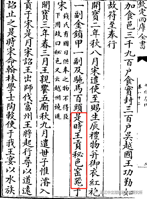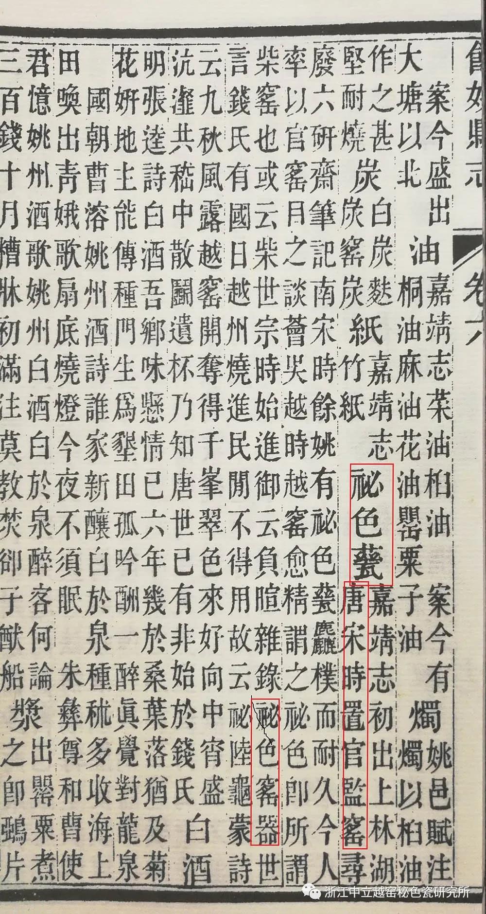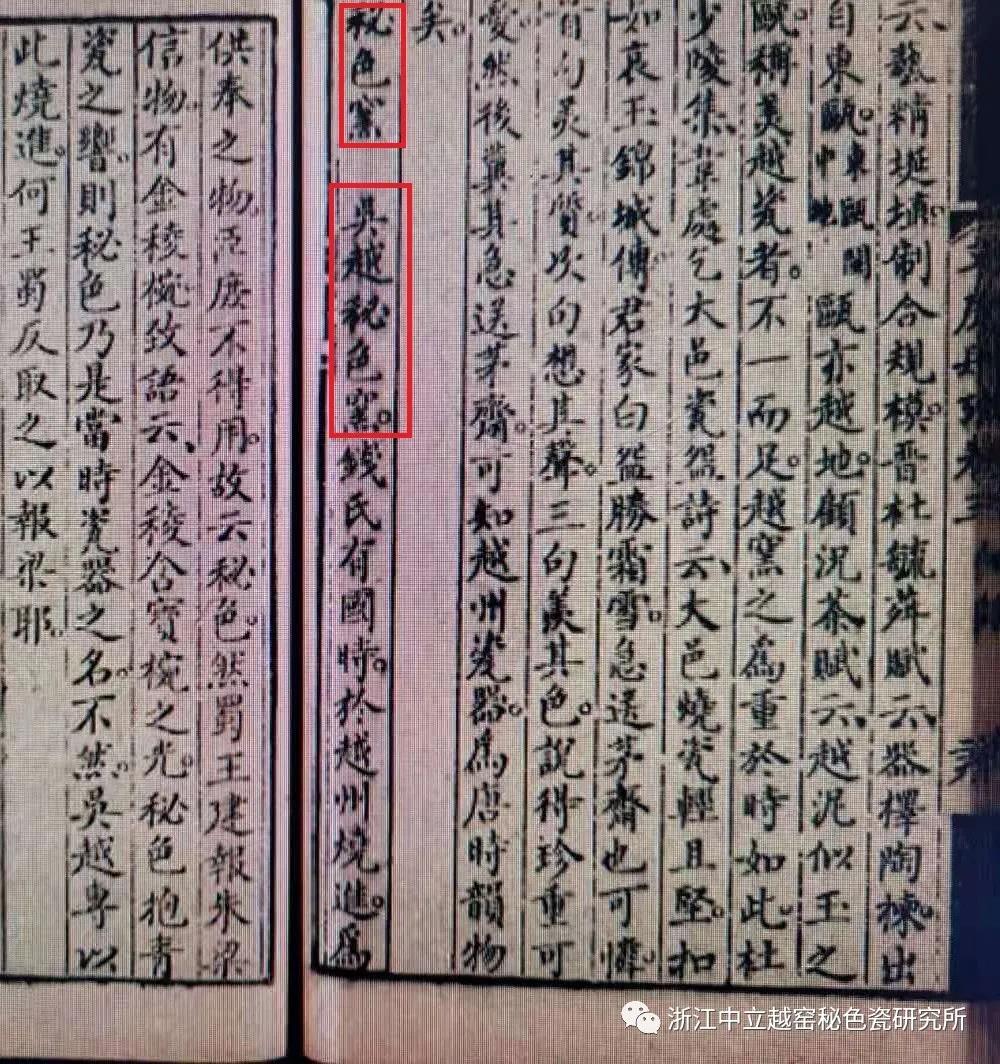 2.《余姚六倉志》卷十七錄入宋代顧文薦《負喧雜錄》《秘色窯》:世言錢氏有國日,焼進,物,民間不得用,故謂秘色。宋怡山《秘色窯》:進柴周者刓削尤薄。