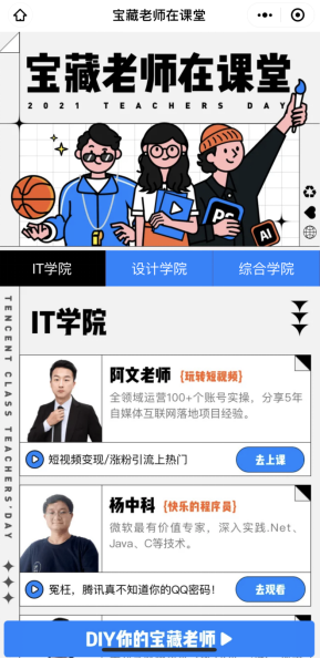 活動期間,用戶登陸騰訊課堂活動專區,即可尋找自己喜歡的老師和觀看喜歡的知識技能視頻,并且通過活動頁面的“DIY你的寶藏老師”拼出自己心目中的好老師。