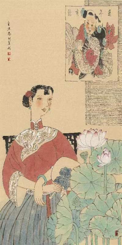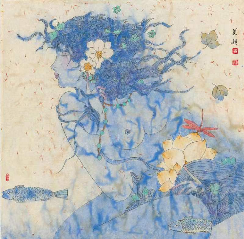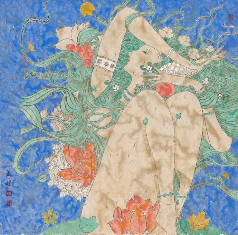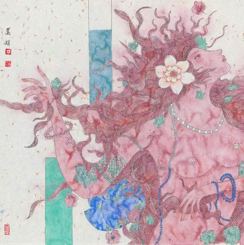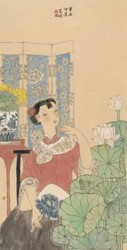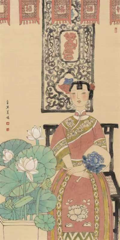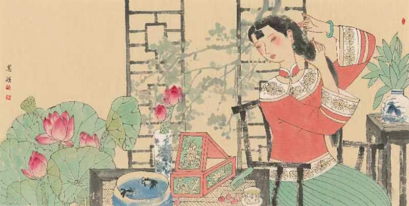 移步前行,中國工筆重彩花鳥、人物畫或筆觸細(xì)膩栩栩如生,或寥寥幾筆神韻飛揚(yáng)。在一幅《晉韻流芳》圖前停下腳步,圖中的女主皮膚白晳、鵝頸優(yōu)雅,華服美顏,十指纖纖,微風(fēng)逗弄額前一縷俏皮的流海,發(fā)上紅花與庭前荷事相映生姿,午后暖陽慵懶地?fù)嶂紊先耍钊瞬蝗套洳剑胳o靜佇立,感受似水流年。