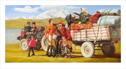 畫(huà)家選取了初春時(shí)節(jié)金黃色陽(yáng)光照耀著的塔吉克族為代表一家人準(zhǔn)備乘載拖拉機(jī)出行的場(chǎng)景,畫(huà)面以女人和孩子為主要的表現(xiàn)對(duì)象,人物安排錯(cuò)落有致,虛實(shí)相應(yīng)。即使將人物一組單獨(dú)拿來(lái)看都不乏畫(huà)面的節(jié)奏與韻律,繪畫(huà)語(yǔ)言的藝術(shù)在畫(huà)家的筆下悄然形成,一切都好似有了呼吸一般。拖拉機(jī)作為工業(yè)感的大機(jī)器橫構(gòu)并貫穿于人物身后,其形態(tài)的硬朗平衡了女人們的柔和,增添了畫(huà)面的時(shí)代感于現(xiàn)代氣息。活動(dòng)著的人物與他們的日常身后,卡拉庫(kù)勒湖靜靜的躺在那里,注視著一切發(fā)生,目送萬(wàn)物的每一次經(jīng)過(guò),慕士塔格峰在更遠(yuǎn)處高挺的佇立著,見(jiàn)證無(wú)數(shù)個(gè)四季發(fā)生,無(wú)論時(shí)代如何變遷,“神山圣水”永遠(yuǎn)安寧,永遠(yuǎn)不變。