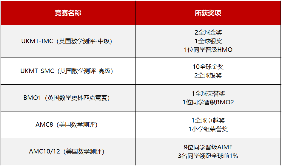 在歷次國際競賽中,狄邦肯思學子亦有不俗的表現。在美國數學測評(AMC)中,3名同學成績領跑全球前1%,9名同學晉級AIME(美國數學邀請賽,美國國際數學奧林匹克IMO代表隊系列選拔賽的第二項賽事);在英國數學測評(UKMT)高級賽事中,狄邦肯思學子獲得10枚全球金獎,2枚全球銀獎;在英國數學奧林匹克競賽BMO1中,獲得1枚全球榮譽獎,并有1位同學晉級BMO2(英國奧林匹克數學活動Round2),競賽成績十分亮眼。