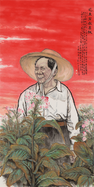 為紀念毛主席視察河南襄城縣六十五周年,畫家劉子默老師緬懷對偉人的崇敬之情,創作中國畫《毛主席在襄城》。這幅作品以煙田為背景,偉人臉上洋溢著喜悅,天空披滿彩霞,與人物前面煙草花呼應,烘托出偉人對未來的發展充滿了希望!