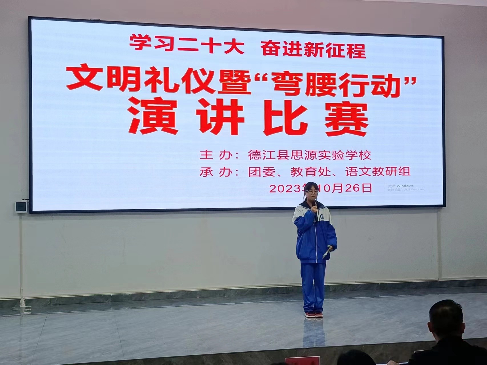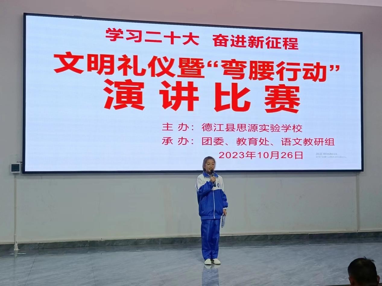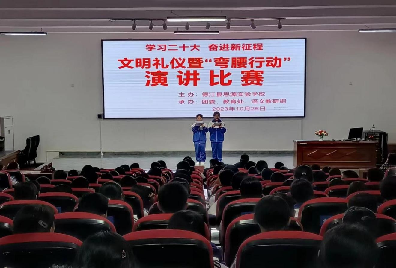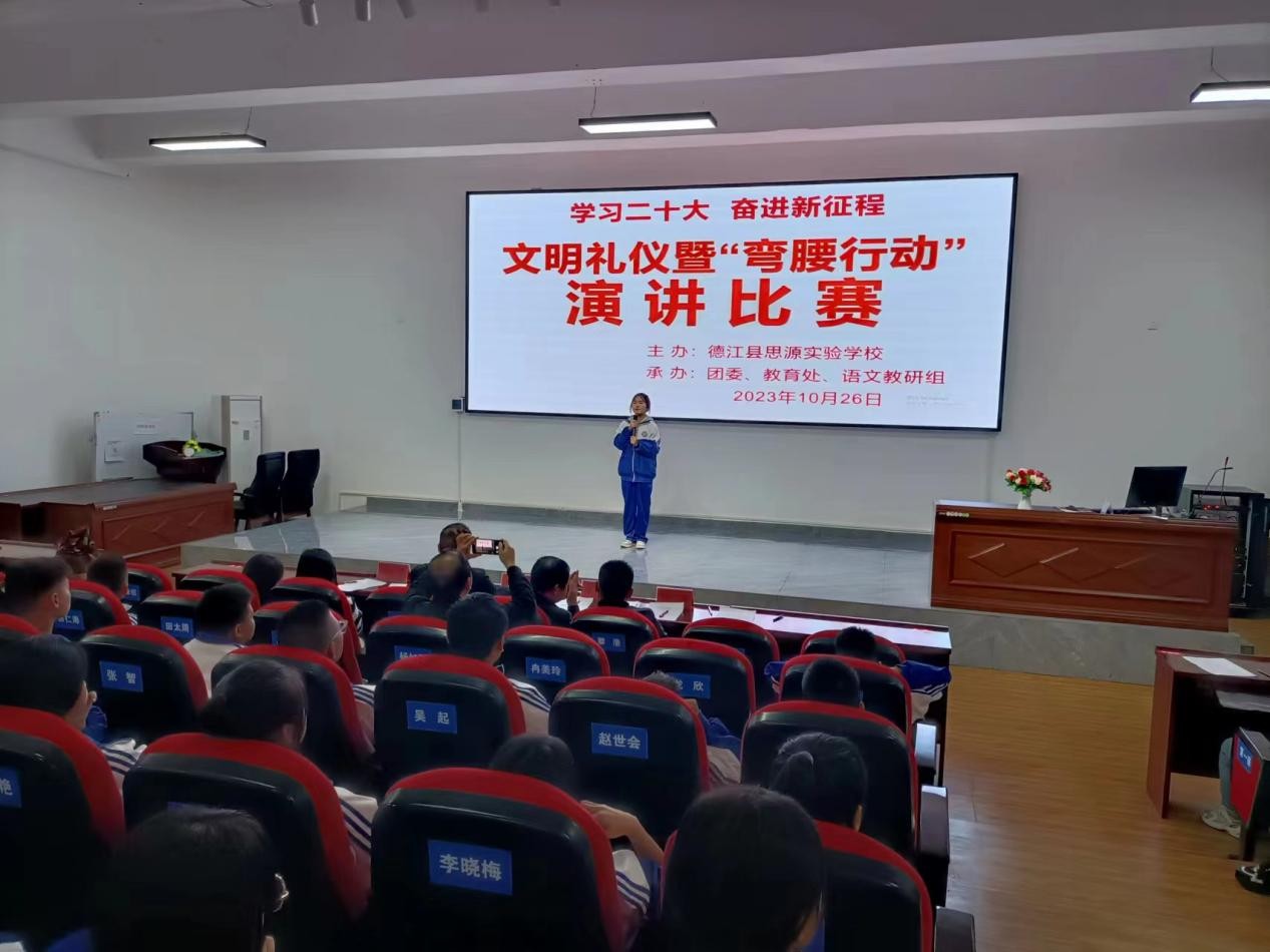 10月26日,德江縣思源實驗學校圍繞“學習二十大 奮進新征程,文明禮儀暨‘彎腰行動’”為主題,開展學生演講比賽活動,該校32名選手參加。