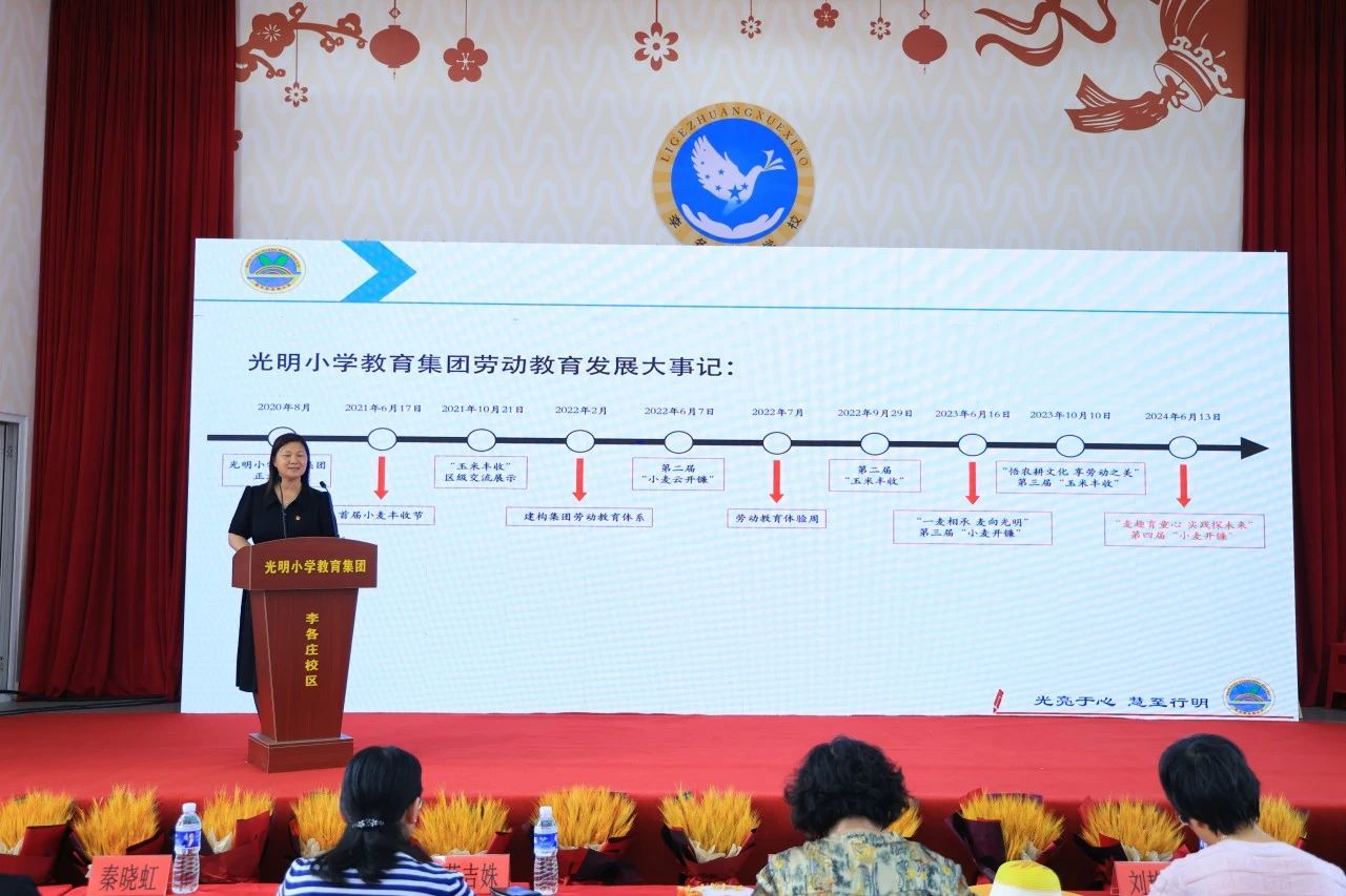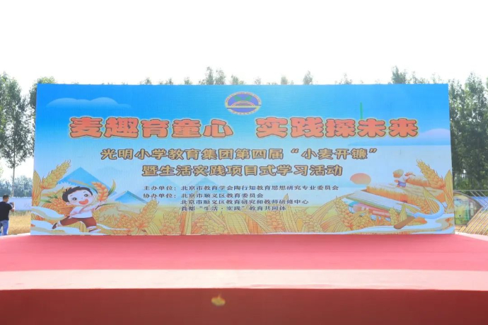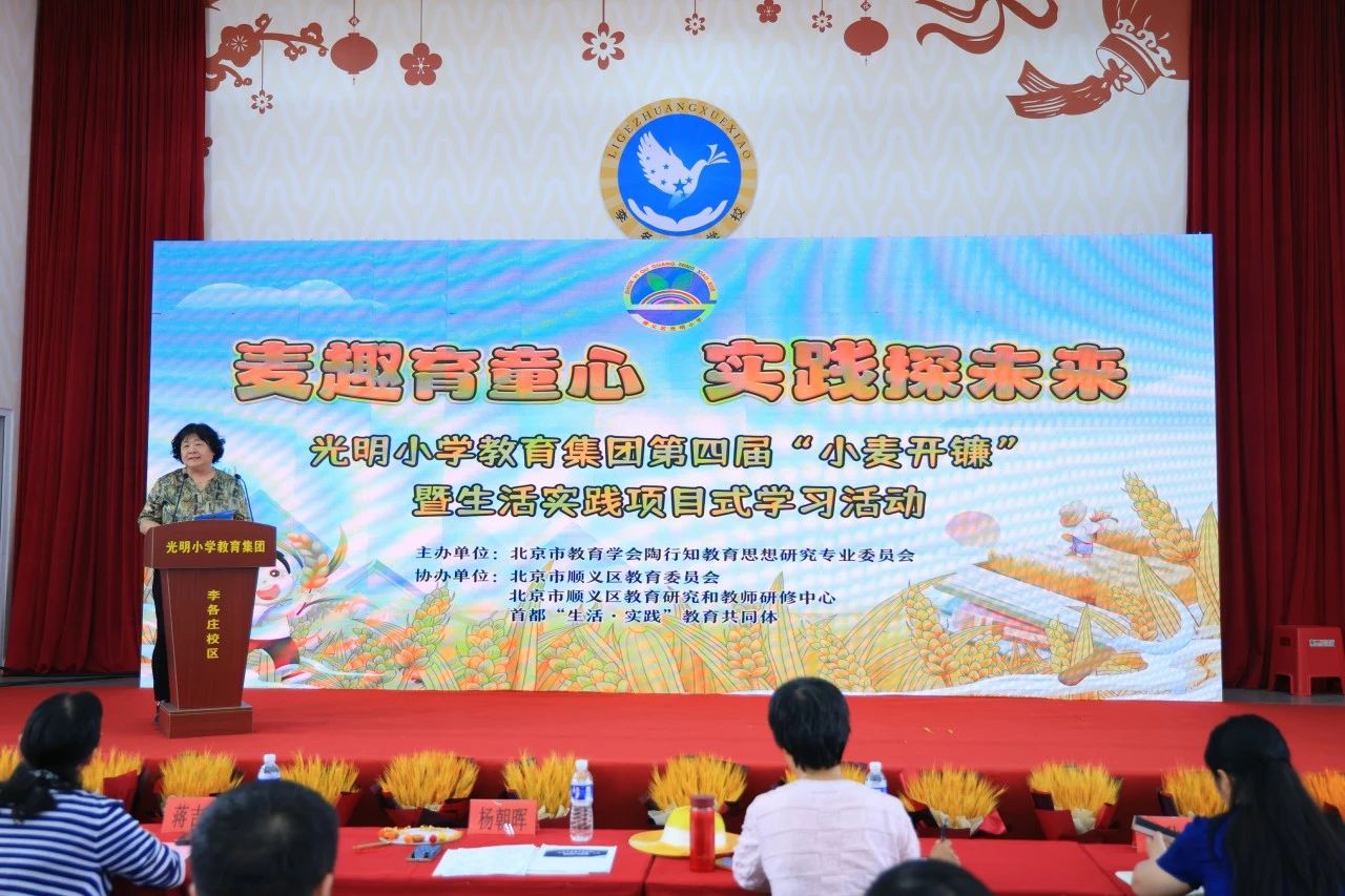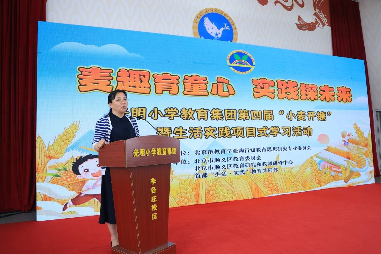為貫徹習(xí)近平總書記重要講話精神,落實(shí)立德樹人根本任務(wù),弘揚(yáng)教育家精神,進(jìn)一步傳承和創(chuàng)新陶行知先生的“生活教育”思想,把握新時(shí)代勞動(dòng)教育的內(nèi)涵與核心要義,2024年6月13日上午,光明小學(xué)教育集團(tuán)舉辦第四屆“小麥開鐮”暨生活實(shí)踐項(xiàng)目式學(xué)習(xí)活動(dòng)。參加本次活動(dòng)的嘉賓有:順義區(qū)教委副主任蔣吉姝、北京市陶行知教育思想研究專業(yè)委員會(huì)理事長(zhǎng)楊朝暉、北京師范大學(xué)繼續(xù)教育與教師培訓(xùn)學(xué)院EDP中心主任秦曉虹、北京教育學(xué)院副教授劉艷茹、木林鎮(zhèn)政府副鎮(zhèn)長(zhǎng)尹相南、順義區(qū)關(guān)工委主任李衛(wèi)國(guó)、辦公室副主任張忠、順義區(qū)教委小學(xué)教育科科長(zhǎng)黃秋鳳、順義區(qū)教育研究與教師研修中心主任王義清、順義區(qū)督學(xué)李冬紅、朝陽(yáng)區(qū)呼家樓小學(xué)副校長(zhǎng)王杰和徐峪森、光明小學(xué)“麥客”聯(lián)盟校:東風(fēng)教育集團(tuán)校長(zhǎng)王闊、石園教育集團(tuán)校長(zhǎng)楊宏偉、順義一中附小校長(zhǎng)楊文智、順義區(qū)教委小教科屈建民副校長(zhǎng)、孫帥主任、順義區(qū)各小學(xué)勞動(dòng)教育主管領(lǐng)導(dǎo)、光明小學(xué)家長(zhǎng)志愿者,以及來(lái)自北京電視臺(tái)、順義電視臺(tái)的媒體朋友們。