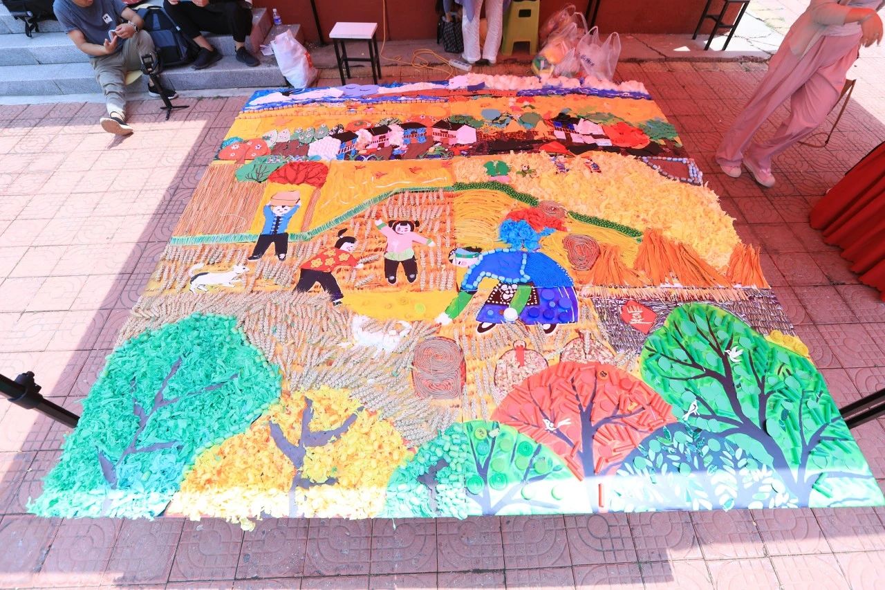 為培養(yǎng)學(xué)生的環(huán)保意識(shí)和創(chuàng)新能力,利用廢舊的物品經(jīng)過(guò)設(shè)計(jì)、粘貼,大家共同完成了“麥鐮畫實(shí)踐圖”。