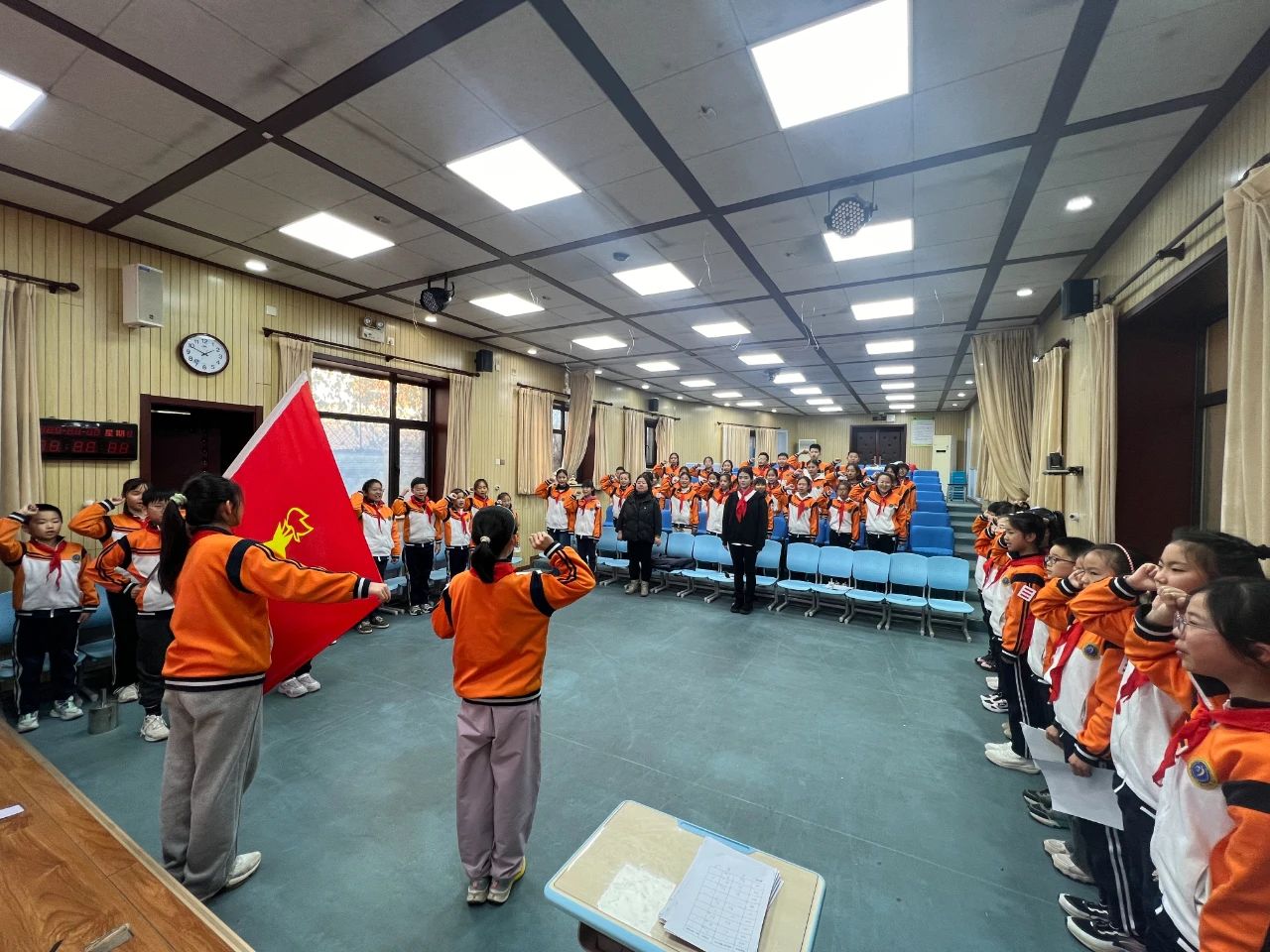 在莊嚴肅穆的氛圍中,全體大隊委成員身著整潔校服,佩戴鮮艷紅領巾,整齊起立,面向神圣的隊旗。大隊長有力地發出“我宣誓!”的領誓聲,全體成員齊聲響應。他們目光堅定,緊握右拳,鄭重地跟讀每一句誓詞。