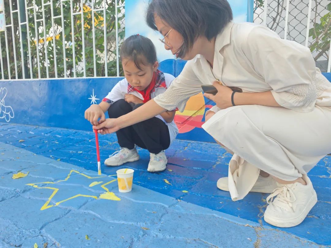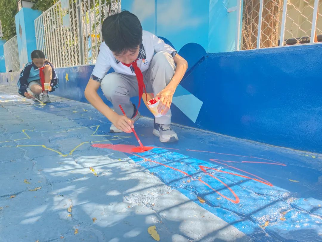 部分學生代表參與了學安路星際圖景的繪畫。他們用顏料點綴出星星的閃爍質感,畫出彎月的溫柔弧度,還在月亮周圍添上夢幻的光暈......同學們一邊繪畫,一邊互相交流著對宇宙的憧憬,分享著自己筆下每個細節的創意來源,仿佛將對太空的向往都傾注在了繪畫過程中。
