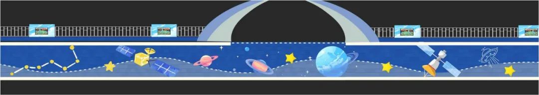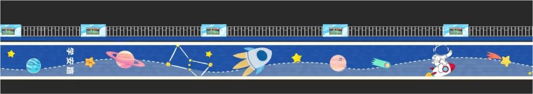 漫步學安路,航天元素與校園文化交相輝映,形成獨特的視覺語言。道路顯眼位置設置的航天主題文化墻,以活潑的卡通風格呈現火箭升空、宇航員漫步星際等場景,既傳遞“減速慢行” 的安全提示,又潛移默化地普及航天知識。各大星云圖也成為學生討論學習的熱點。校門口左右兩側的展示區,更成為了校園文化的“微窗口”,繪畫作品記錄的校園生活場景,展示出學生在德、智、體、美、勞等方面全面發展。