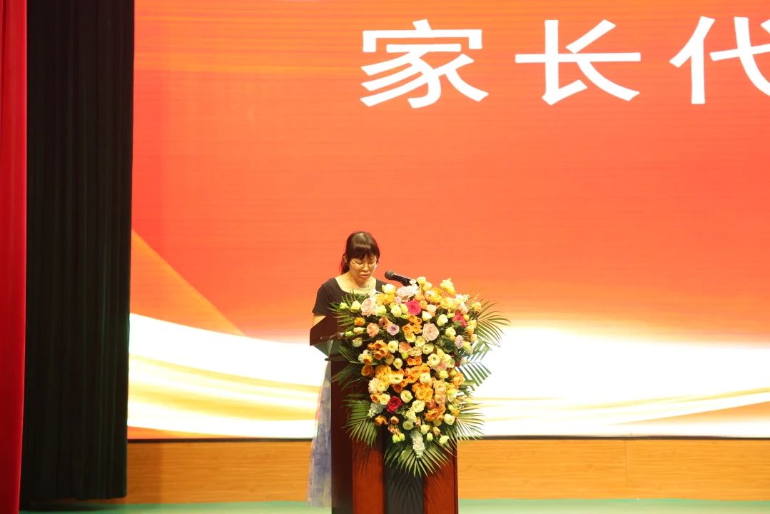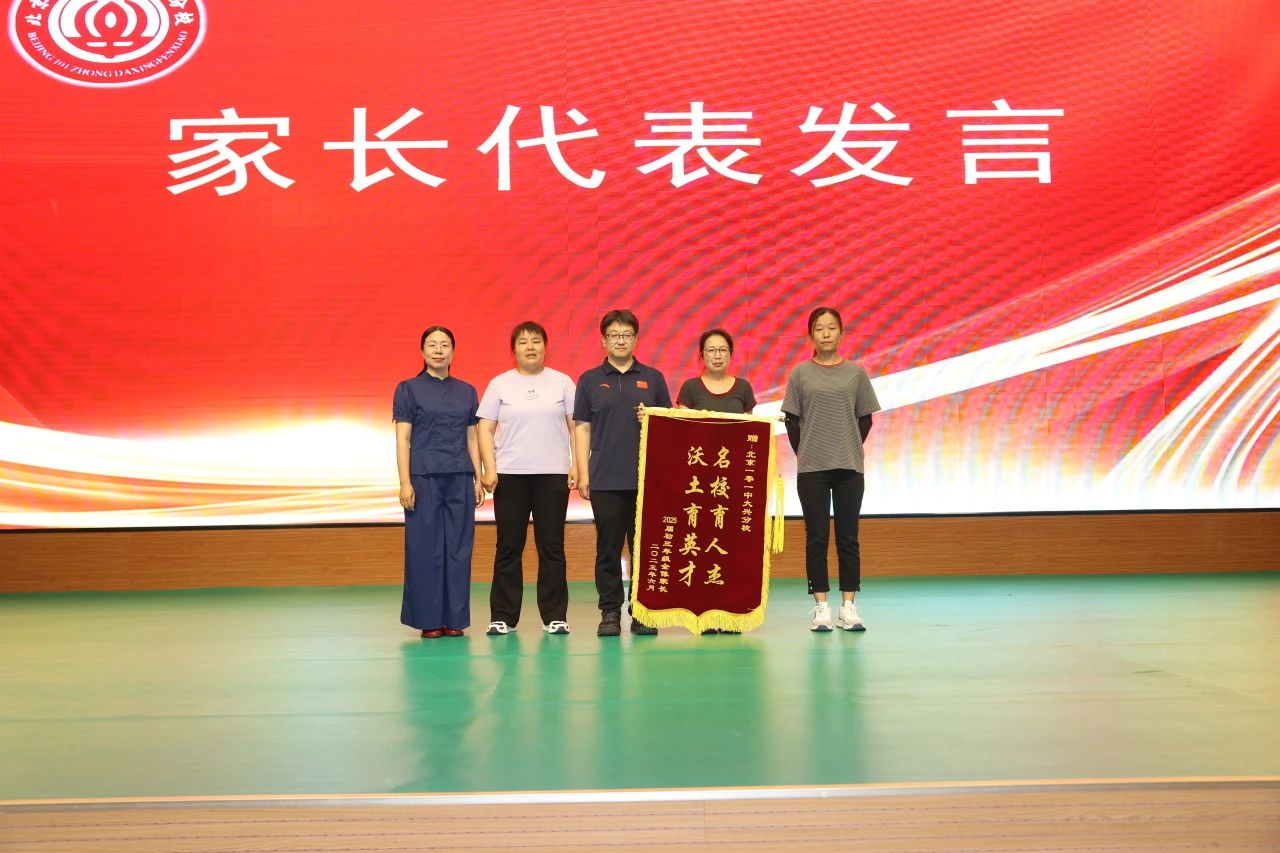 家長代表周鵬飛媽媽的發言真摯感人,字里行間滿溢對學校精心培育的誠摯謝意與對孩子茁壯成長的欣慰自豪。她代表全體家長向學校及年級組以及年級教師表示感謝,并由家長代表分別敬獻了飽含深情的錦旗——“名校育人杰 沃土育英才”贈予學校,“三載栽培恩似海,一生銘記情如山”贈予初三年級,鮮紅的錦旗承載著家長們的最高認可與深切祝福。