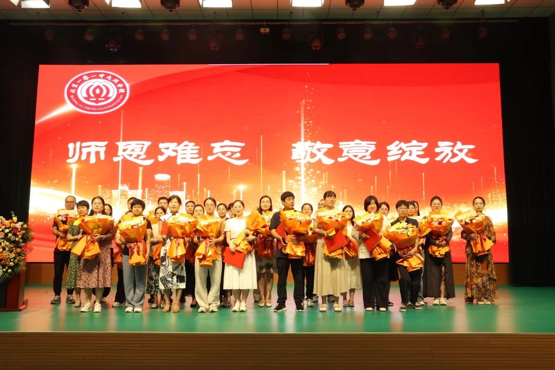 最溫馨感人的時刻莫過于畢業生代表向全體初三任課教師獻花。一束束芬芳的鮮花,一個個深情的鞠躬,一次次溫暖的擁抱,承載著學子們無盡的感恩與祝福。老師們眼含熱淚,欣慰的笑容里滿是驕傲與不舍,現場彌漫著濃濃的師生情誼。