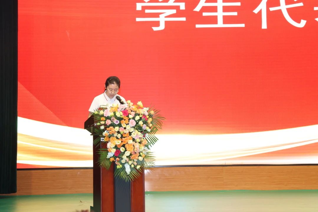 畢業生代表初三4班高子涵同學上臺發言。她分享了三年的收獲與感悟,真誠感謝老師的悉心教導、父母的默默支持與同學的并肩同行。她號召全體同學帶著母校的印記,懷揣夢想與擔當,以更加自信從容的姿態奔赴高中新階段,勇敢迎接未來的機遇與挑戰。