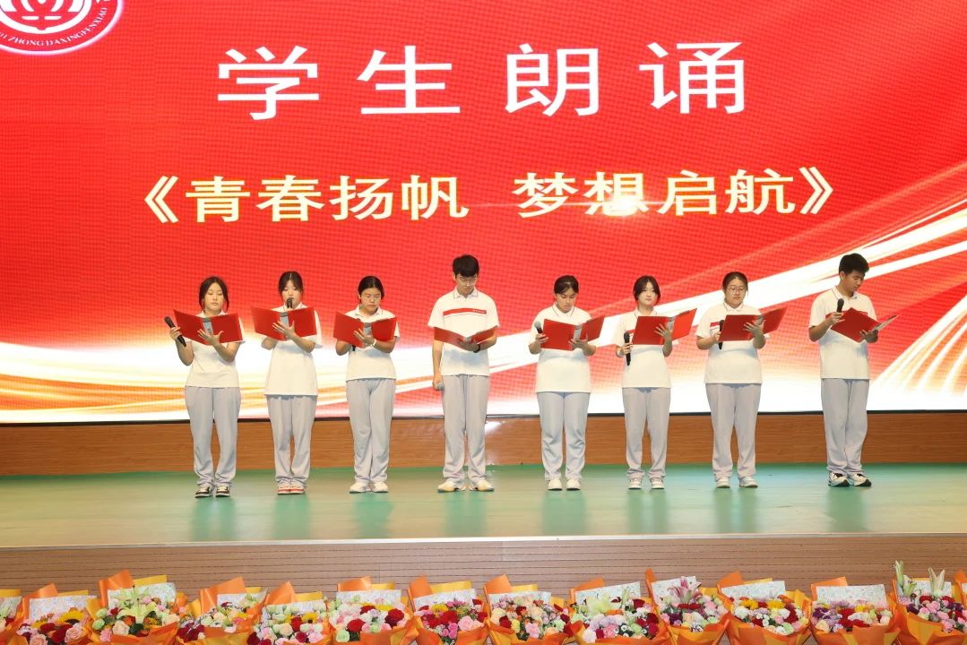 隨后,學生代表深情朗誦了《青春揚帆 夢想啟航》。飽含激情的詩句,回顧了同窗共讀的美好時光,抒發了對母校的眷戀不舍,更以鏗鏘誓言表達了“乘風破浪會有時,直掛云帆濟滄海”的豪情壯志,展現了新時代青年昂揚向上的精神風貌。