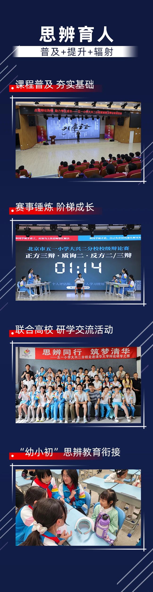 五一小學(xué)大興二分校辯論隊(duì)此次能夠取得如此驕人的成績,離不開學(xué)校“思辨育人”教育理念的深厚土壤。近年來,學(xué)校致力于構(gòu)建“普及+提升+輻射”的辯論教育體系,將思辨能力的培養(yǎng)融入日常教學(xué)與校園文化之中。具體而言,學(xué)校通過多層次的活動(dòng)與合作,全面培養(yǎng)學(xué)生的思辨能力。