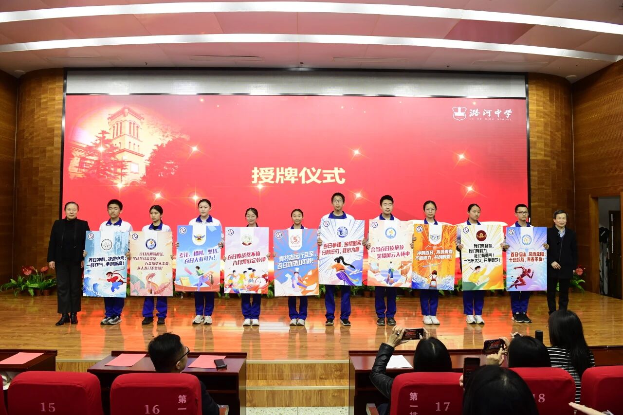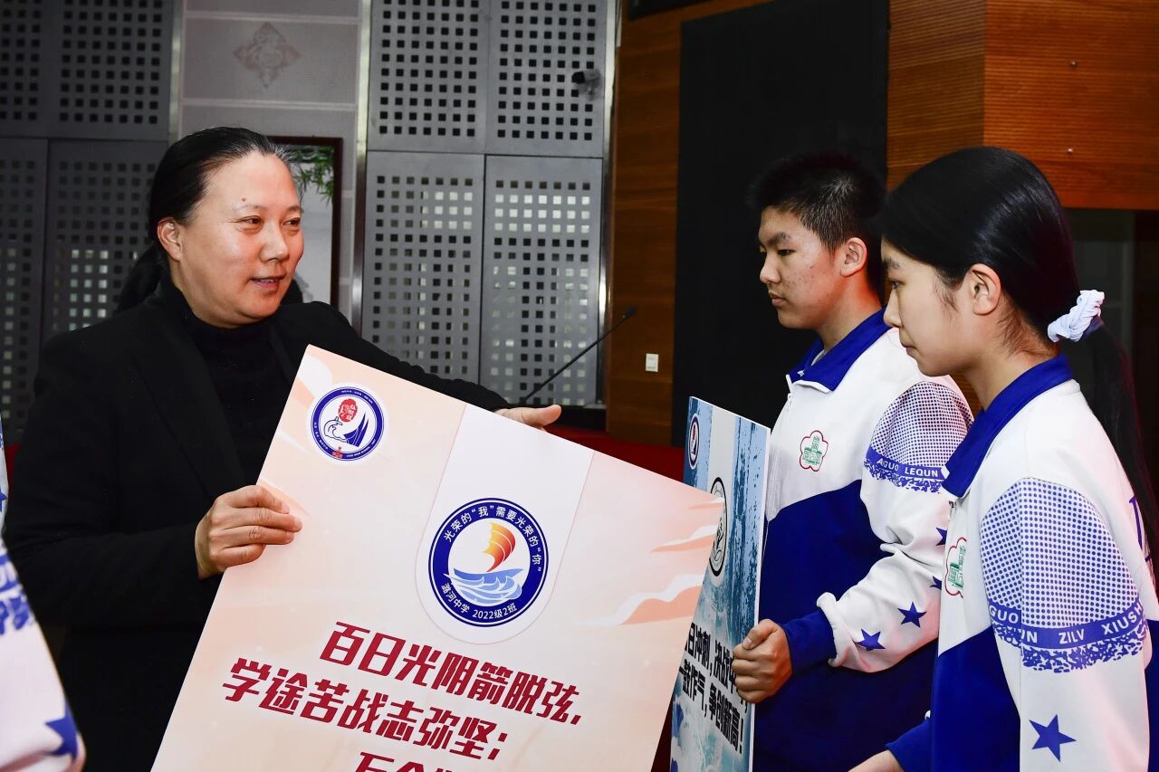 在雷鳴般的掌聲中,謝宏春副校長與李晨松副校長為各班授予百日宣誓牌。鐫刻各班標語的宣誓牌化作沖鋒的戰鼓。各班班長高舉宣誓牌的挺拔身姿,凝成初三學子勇毅前行的精神圖騰。