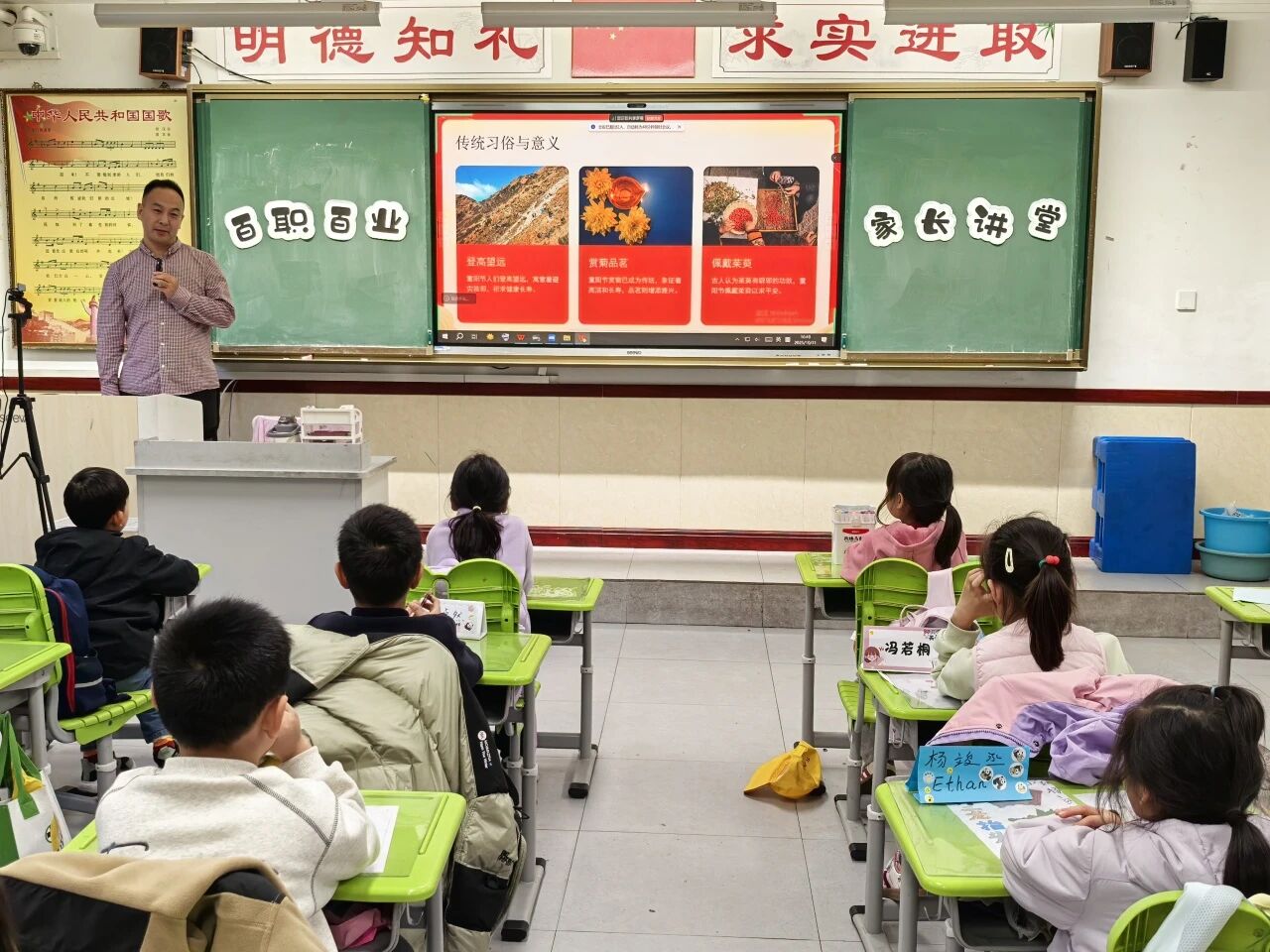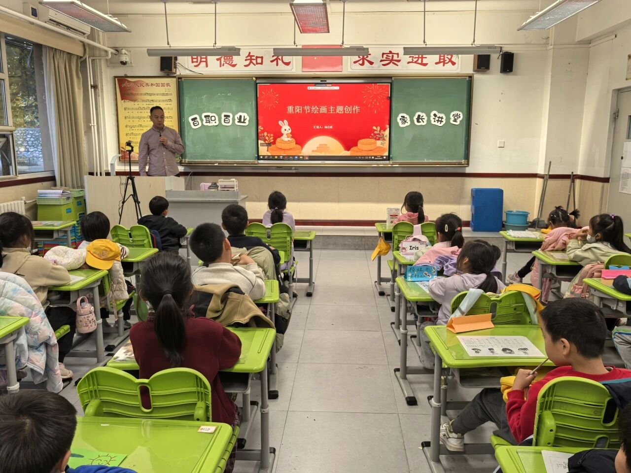 10月31日學校的家長講堂活動邀請到二八班楊雨彤同學的爸爸。楊老師在重陽節來臨之際,帶著精心準備的《重陽節繪畫主題創作》分享,給孩子們帶來了一堂生動又有趣的節日文化課。讓同學們在聽故事、學知識、悟創意中,讀懂重陽的傳統韻味。