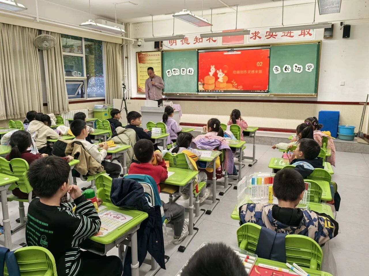 了解了重陽節的傳統文化,最讓孩子們期待的繪畫創作環節來啦!楊老師結合課件中的靈感來源,引導孩子們提取重陽元素:金黃的菊花、登高的人群、美味的重陽糕,還有祖孫相伴的溫馨畫面,都可以成為畫中的主角。同時,還分享了實用的小技巧:用溫暖的橙色、黃色表現秋日氛圍,用靈動的線條勾勒人物動態,讓畫面更有層次感。孩子們聽得目不轉睛,小腦袋里早已構思起屬于自己的重陽畫作。