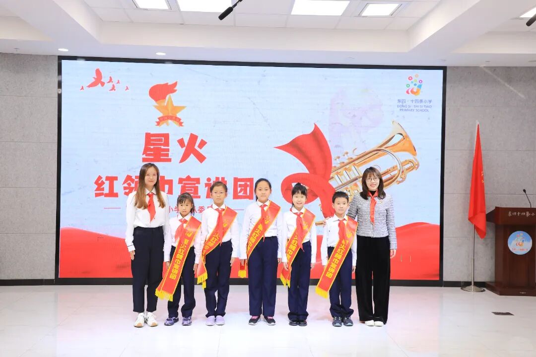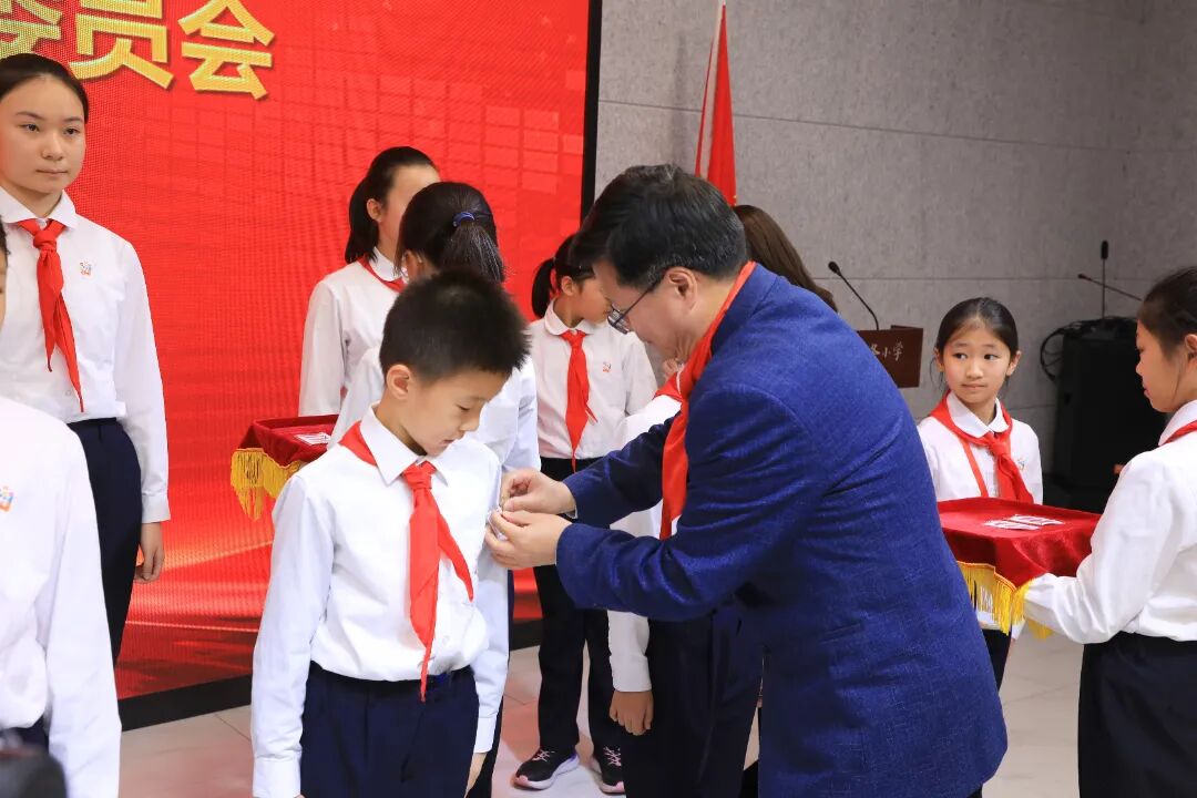 同時,一個肩負著傳承使命的新組織——“星火紅領巾宣講團”正式成立!首批26名成員從各中隊中脫穎而出,德育處景影主任和大隊輔導員王穎老師為成員代表鄭重佩戴綬帶。希望宣講員們用童聲講述紅色故事,讓星星之火,可以燎原!