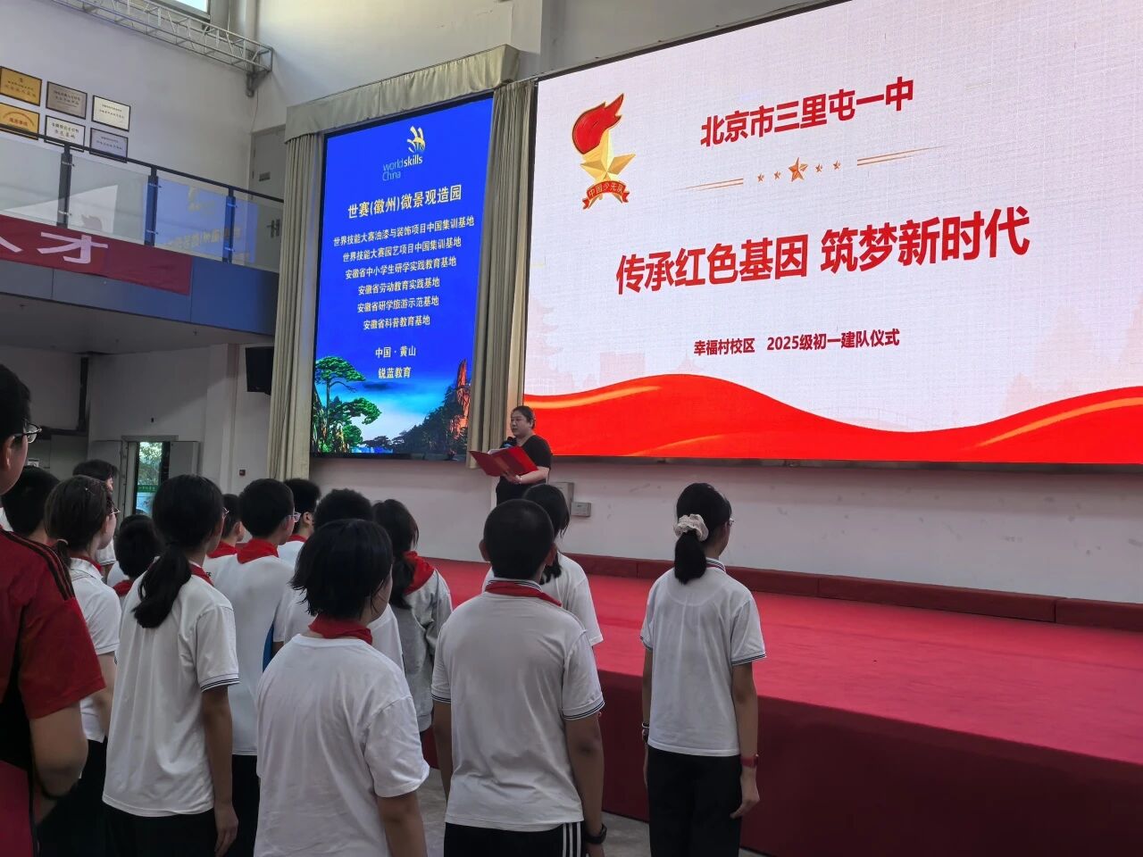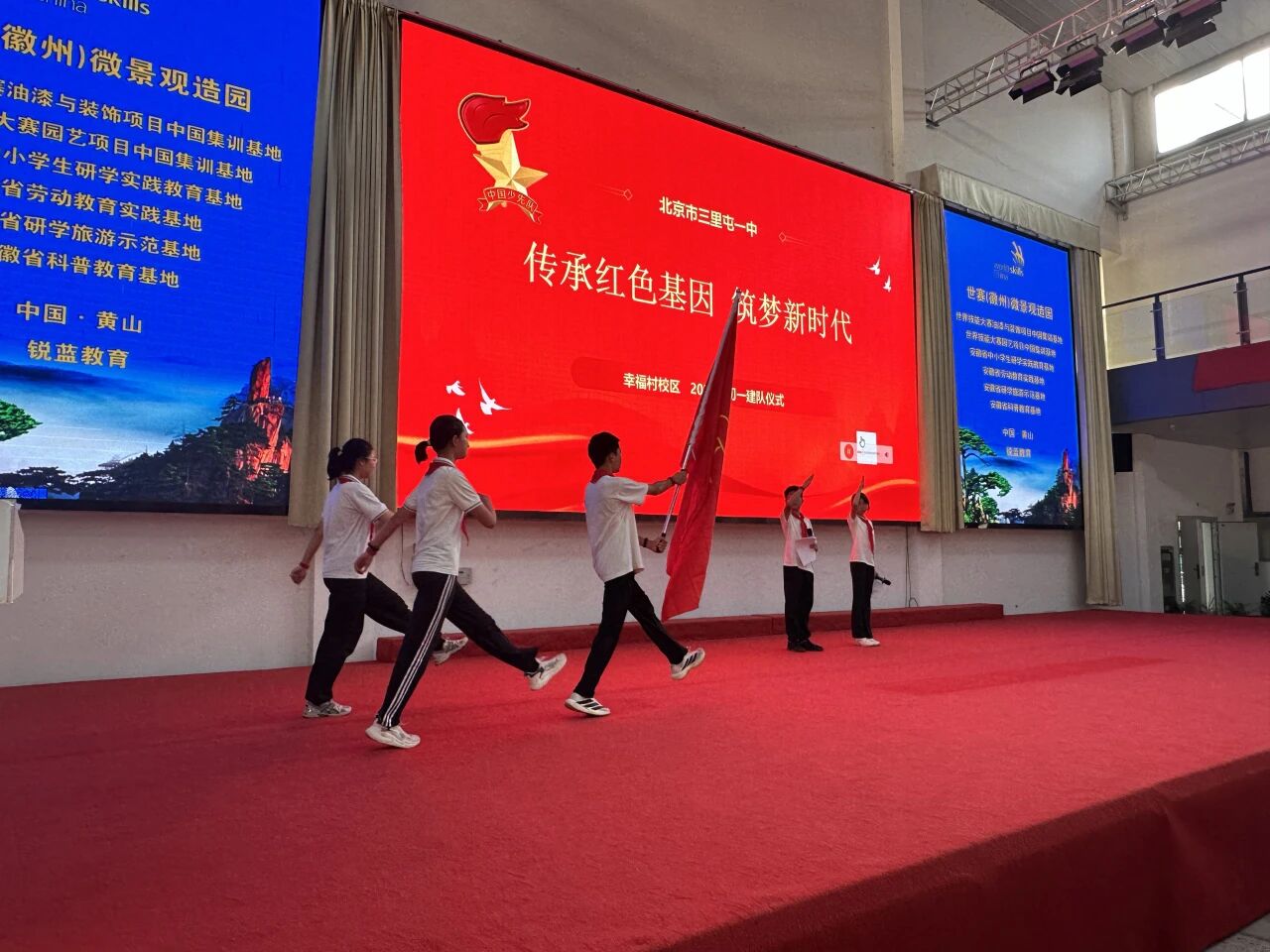 為傳承紅色基因,激勵學生樹立遠大理想,北京市三里屯一中幸福村校區在10月9日于徽州潤一園藝基地舉行了 2025 級初一建隊儀式與 2024 級初二離隊建團儀式,兩場活動分別以 “紅色傳承” 與 “青春成長” 為核心,為初一、初二學生搭建了思想成長與身份轉變的重要平臺。
