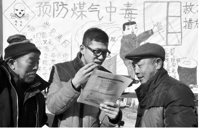 日前,大學生志愿者劉兆雷在向村民講解預防煤氣中毒的措施。山東聊城大學化學學院大學生志愿者來到聊城市馬官屯村,開展冬季預防煤氣中毒宣傳活動。志愿者們通過向村民講解冬季取暖安全防護措施以及煤氣中毒的危害,并現場演示遇到煤氣中毒的搶救方法,向村民宣傳冬季安全知識和自我保護方法,增強村民的安全保護意識。志愿者們還發放了200余份預防煤氣中毒的宣傳單,受到村民們的歡迎。(趙玉國 陳昌盛 攝)