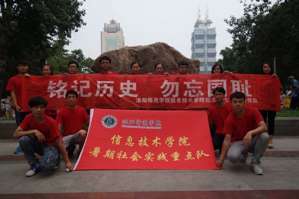 7月7日,為紀念“七七事變”第78周年,社會實踐團小組聯合洛陽紅歌團,在洛陽市王城廣場舉辦“勿忘國恥銘記歷史”紀念活動。舉辦方通過為革命先烈們默哀,橫幅簽字等環節,表達了對中國產黨的崇敬之情和抗戰軍民們的緬懷之情,讓同學們意識到作為社會主義接班人所肩負的使命和責任。
