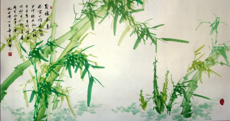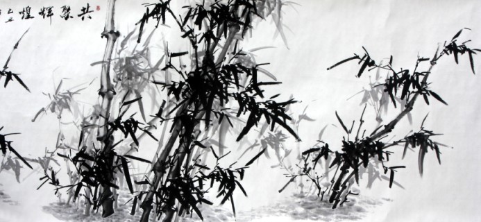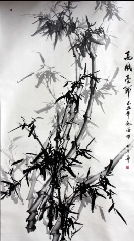 竹,古往今來,名人雅士都喜歡,論竹。晉代王子猷愛竹,說:不可一日無此君耶。所以后世便稱竹為君。鄭板橋一生愛竹、畫竹,在竹中得到精神上極高的享受。特別是蘇東坡曾說:寧可食無肉,不可居無竹。更把竹子的高風亮節,精、氣、神做表率,后人仿之。所以歷代愛畫竹畫家無數,畫竹看似簡單易畫,畫好它卻很難,能畫好竹的畫家不少、但能創造的畫家罕見,能畫大竹、高竹的人不多、但能畫五米以上的高竹更少,主要具備藝術天賦、魄力等多方面因素。