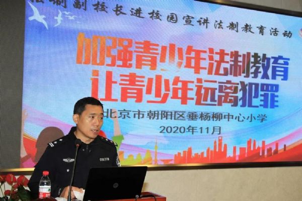 為積極做好法治教育,提高學生法治意識,營造安全和諧的校園環境,2020年11月16日垂楊柳中心小學邀請法制副校長,潘家園派出所祝首川警官走進學校,為全校師生進行法制宣講。