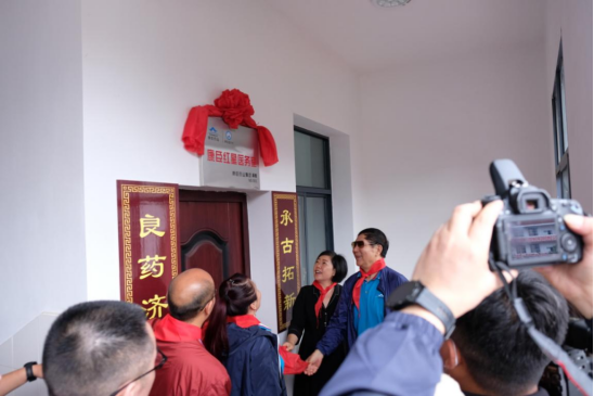 現場,安郁寶先生、黎倩女士,與闕玉英同志、向左輝同志為全國首個“紅星醫務室”揭牌。